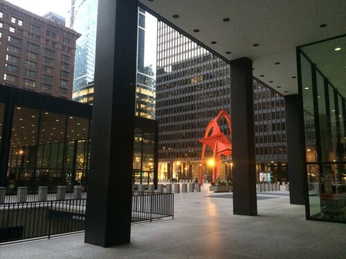 黒塗りの鉄骨フレームとマリオン, ガラス, トラバーチンの壁. シカゴのIBMビルやレイクショアドライブアパートメント、ニューヨークのシーグラムビルなど、多くのミース建築を今回滞在中に見た. デザインコードが共通のため, おそらく部分だけを見せられたら…