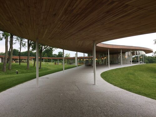 丘の起伏に沿って蛇行する「散歩道」. 途中途中にガラスで仕切られた屋内空間が出現する. それぞれがサロンだったり, レストランだったり, 図書室だったりする. いずれも徹底されているのが, 「室」にならないようにしていること. あくまでもサロンもレスト…