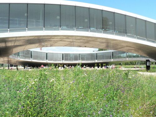 丘の起伏に沿って蛇行する「散歩道」. 途中途中にガラスで仕切られた屋内空間が出現する. それぞれがサロンだったり, レストランだったり, 図書室だったりする. いずれも徹底されているのが, 「室」にならないようにしていること. あくまでもサロンもレスト…